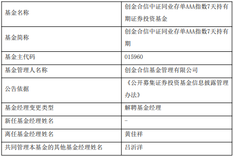 塔城股票配资公司 黄佳祥离任创金合信中证同业存单AAA指数7天持有期